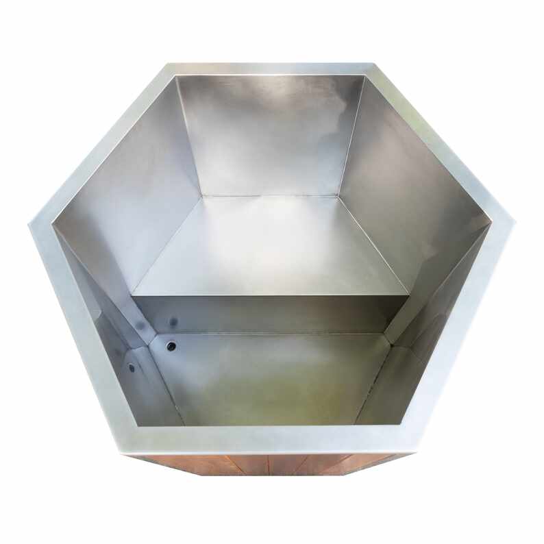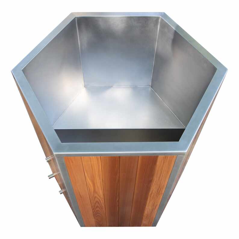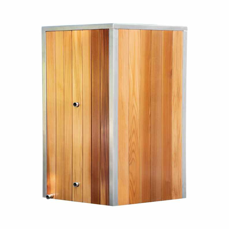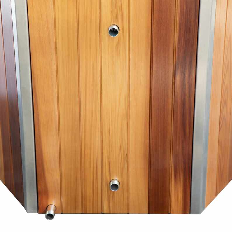 De buitenkant is gemaakt van Canadees rood cederhout en biedt natuurlijke isolatie, vochtbestendigheid en een aantrekkelijke uitstraling Uiterlijk van spa-kwaliteit. De roestvrijstalen voering zorgt voor hygiëne op het hoogste niveau, eenvoudige reiniging en duurzaamheid op lange termijn zelfs bij veelvuldig gebruik.