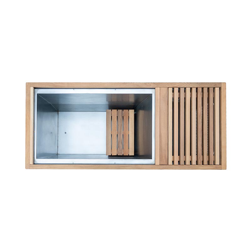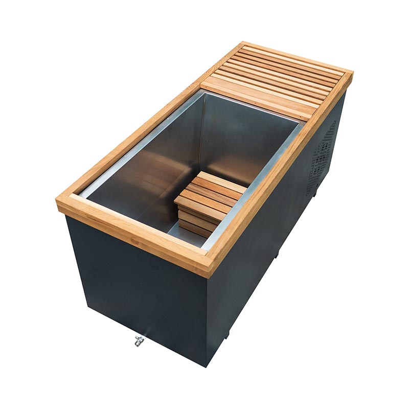 De buitenkant is gemaakt van premium red cedar, gewaardeerd om zijn natuurlijke aroma, maatvastheid en duurzaamheid in vochtrijke atmosferen zoals spa's, thermische kamers en wellnessterrassen in de open lucht. Binnenin de 304 De roestvrijstalen voering houdt het water schoon, koel en gemakkelijk te ontsmetten, waardoor het ideaal is voor faciliteiten met zware omstandigheden dagelijks gebruik.