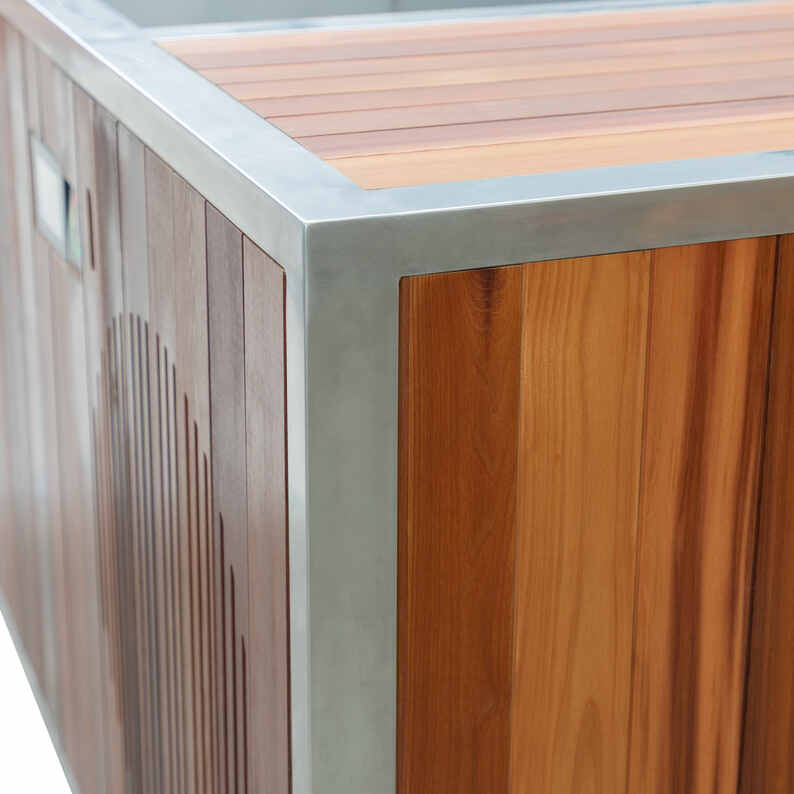 De versterkte, zero-flex constructie en materialen van commerciële kwaliteit maken hem perfect voor professionele sportertherapie centra, spa's en wellnessfaciliteiten met veel verkeer. De cederhouten buitenkant van het bad voegt een premium esthetiek toe terwijl de roestvrijstalen binnenkant zorgt voor eenvoudige reiniging en langdurige betrouwbaarheid.